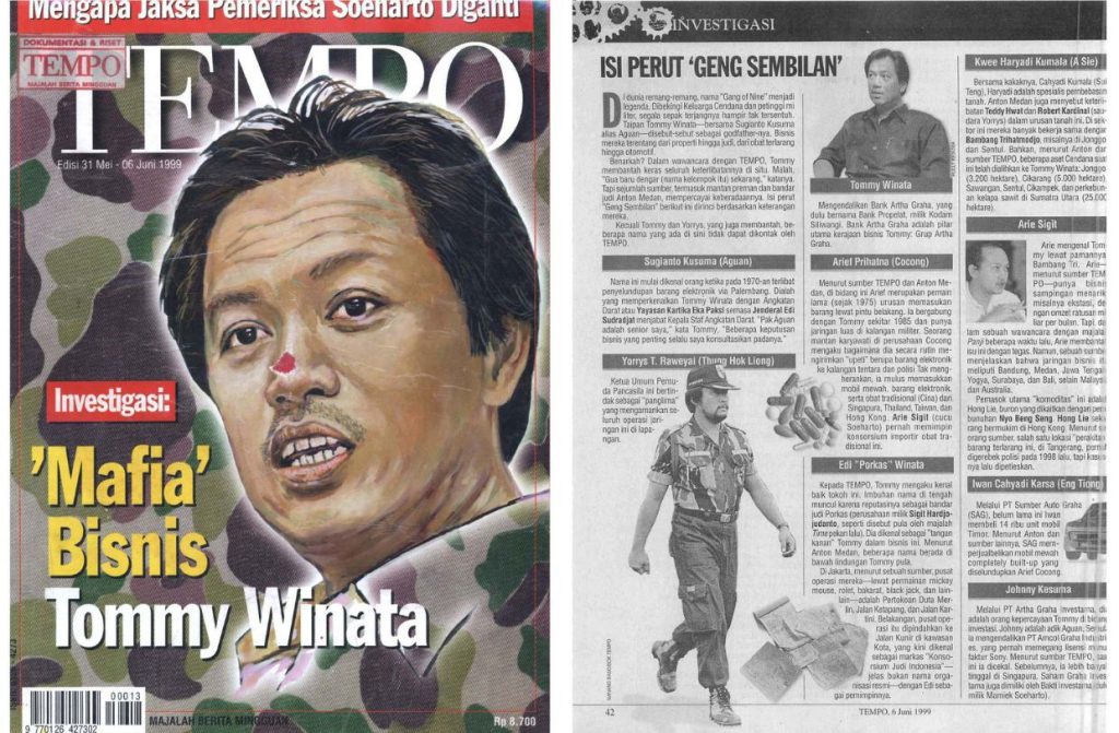 1999年5月末、TEMPOが大手Artha Grahaグループ総帥Tommy Winata氏(中国名:Oe Suat Hong)のインドネシア軍やスハルト家との関係性に導く成功のその裏に関する調査を報道していました。その中で、「TEMPOの複数情報源によると、Tommyが賭博(宝くじの運営)、麻薬、密輸事業を仕切る9人の一人『Gang of Nine』の一人である」と書かれています。ここで初めて『Gang of Nine』、「伝説の九龍」の名前が公に出ました。
